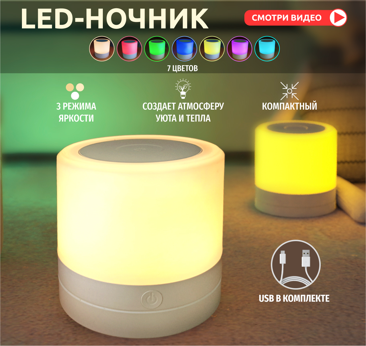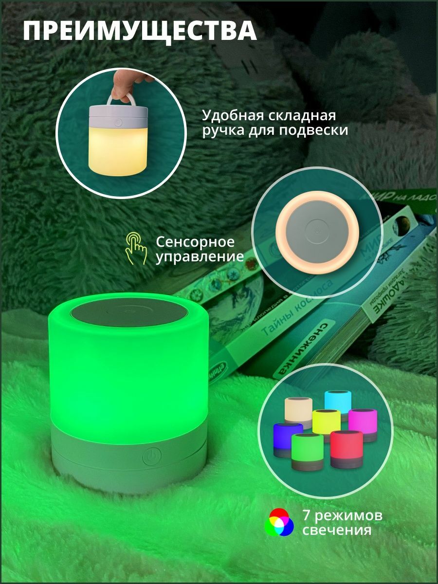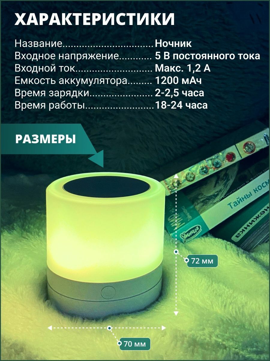 — зеленый цвет – ночник готов к работе, красный цвет – происходит заряд аккумулятора.