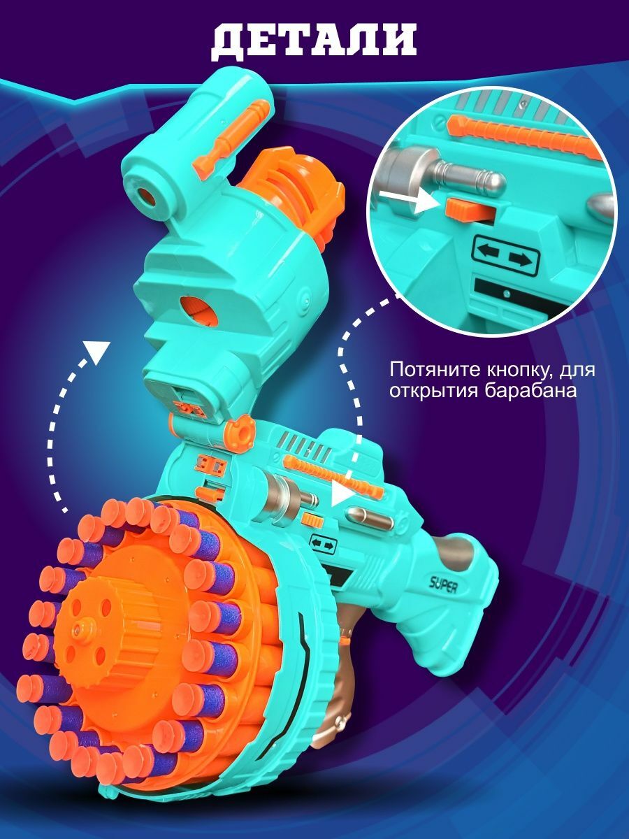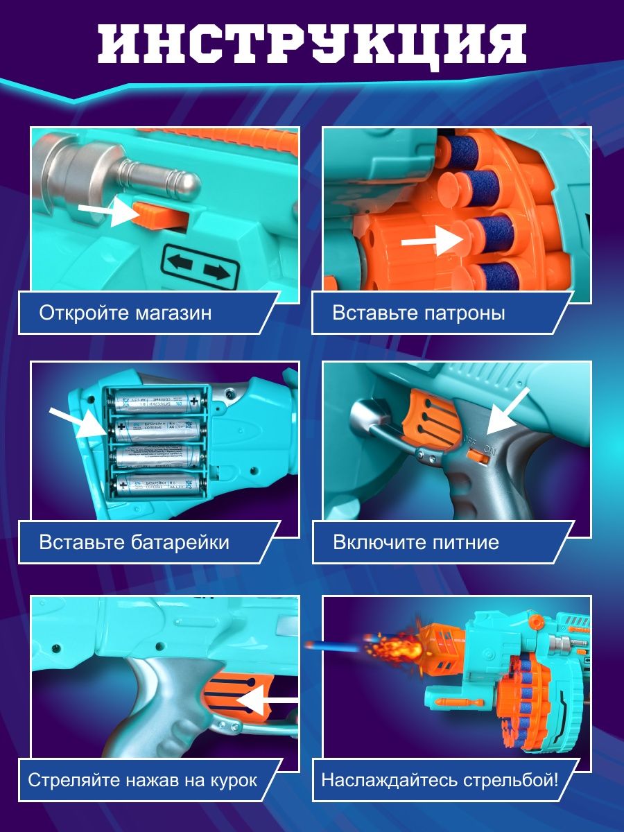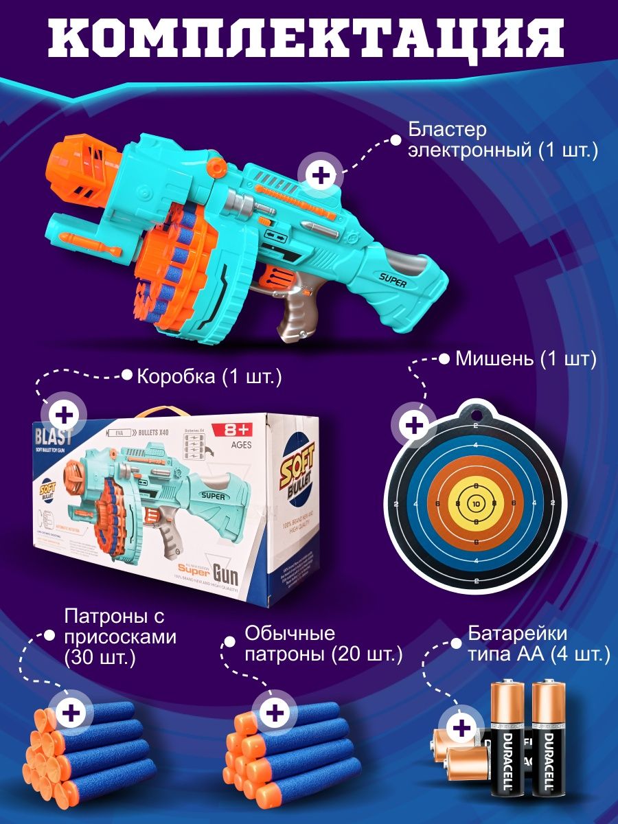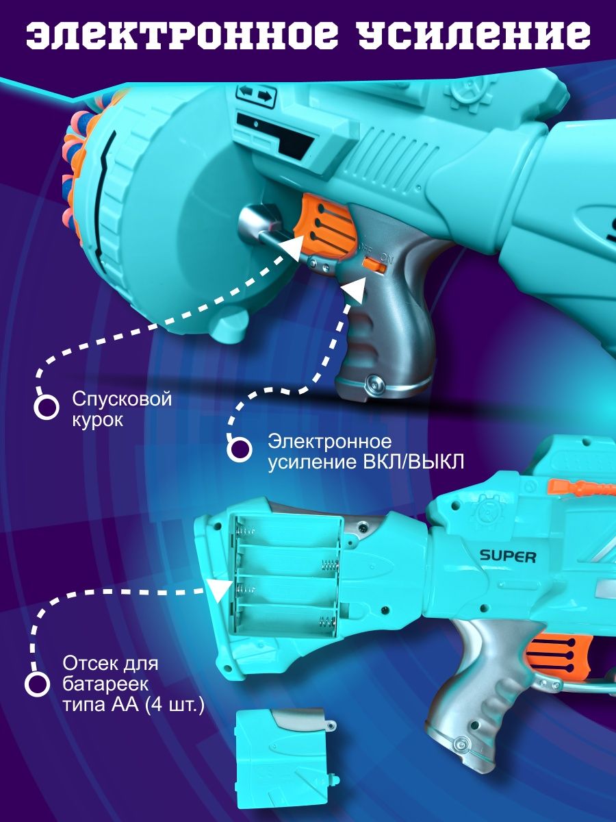 ПРЕИМУЩЕСТВА – мощность бластера позволяет стрелять на большое расстояние. Мягкие пульки не оставляют синяков и ссадин.